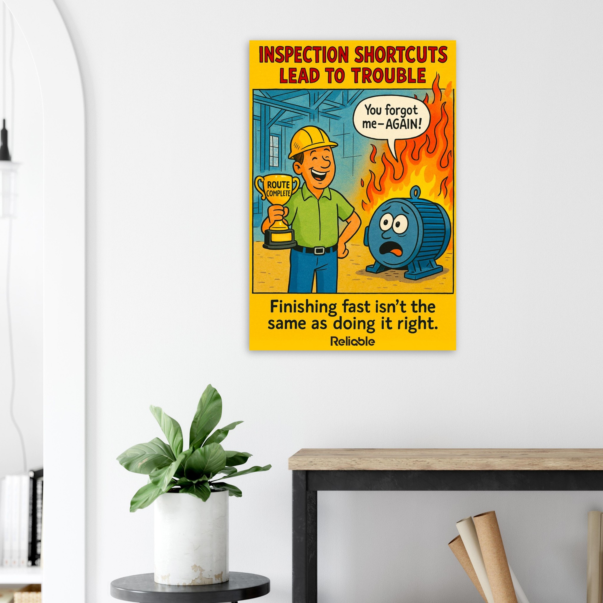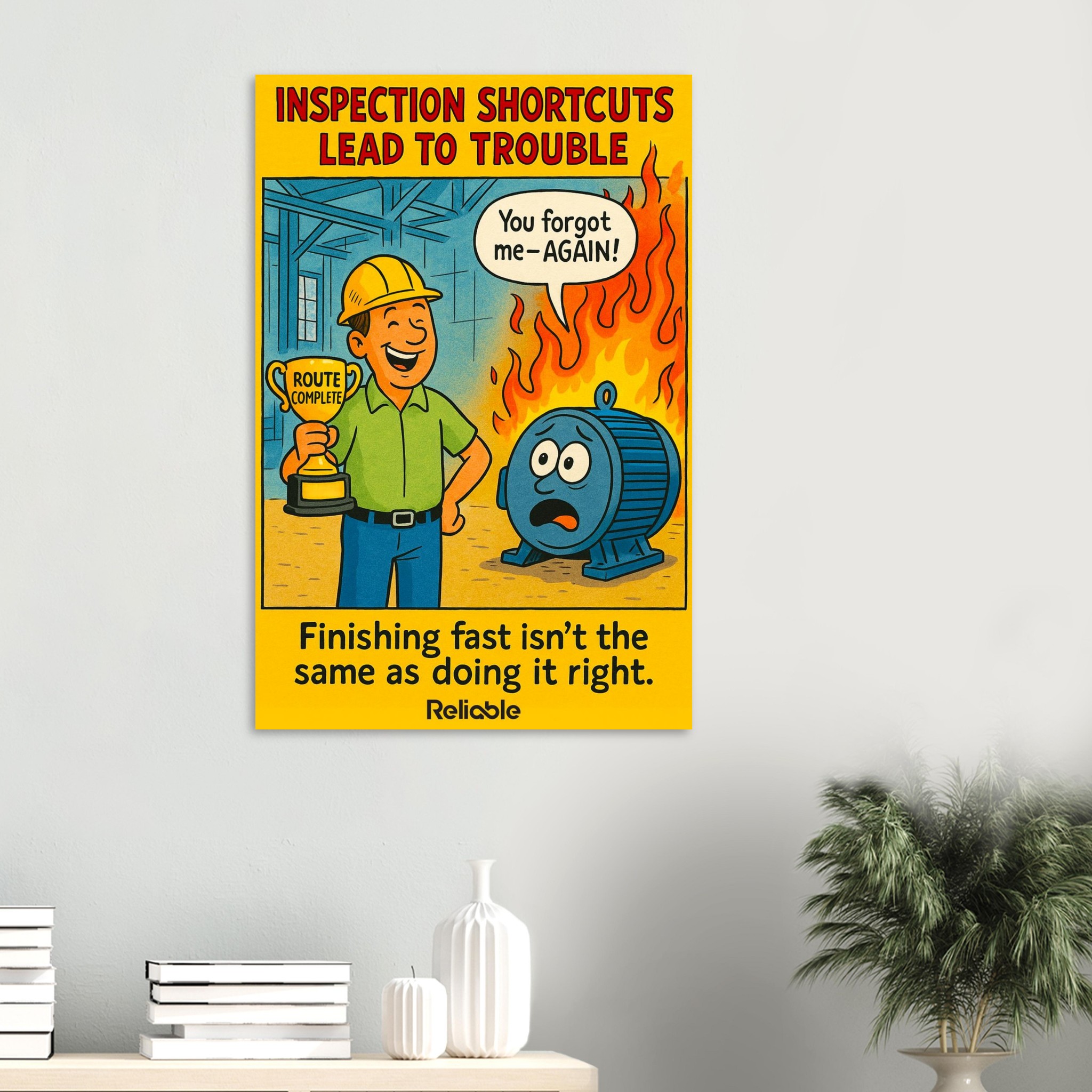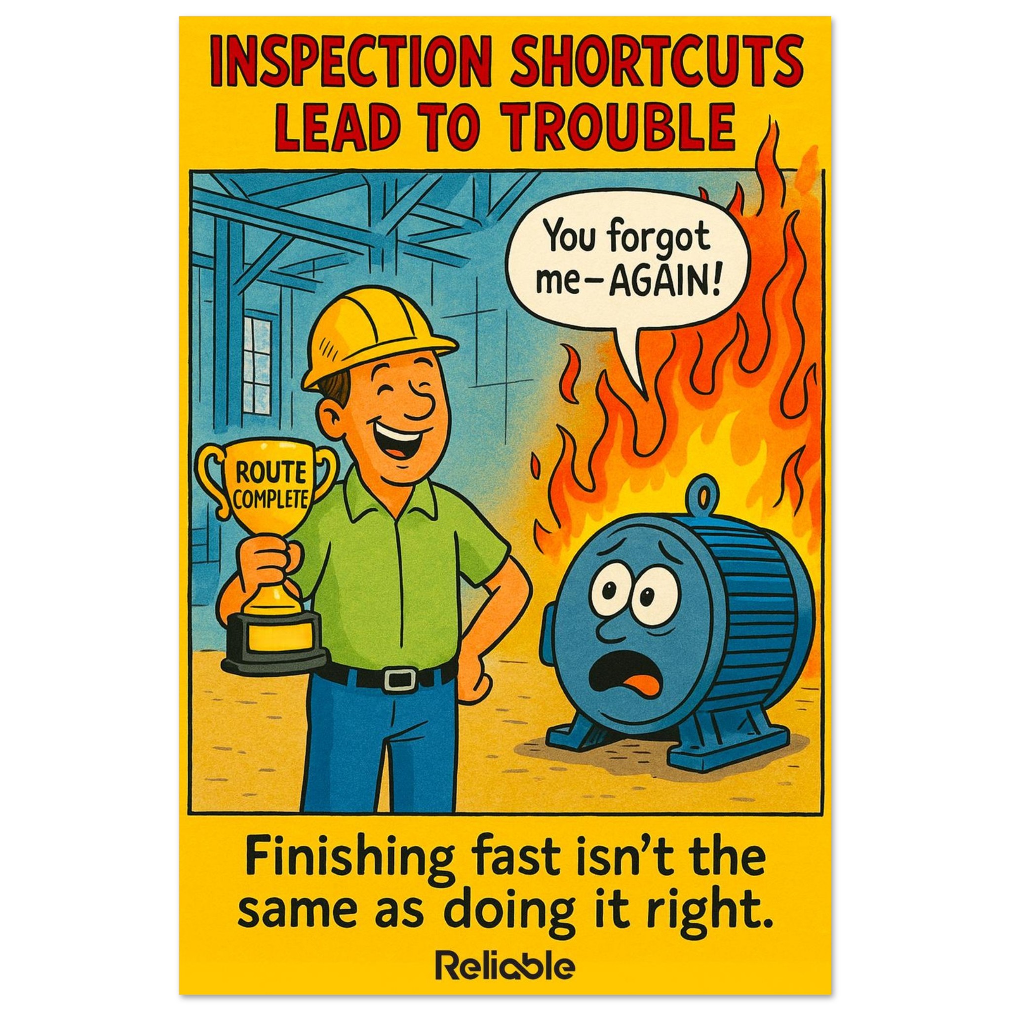 Celebrate speed at your own risk. This hilarious maintenance cartoon shows a smiling tech holding a “Route Complete” trophy while a flaming motor screams, “You forgot me—AGAIN!” The caption says it all: “Finishing fast isn’t the same as doing it right.” A must-have poster for any facility pushing for quality over rushed results. Perfect for inspection teams, maintenance areas, and training rooms.