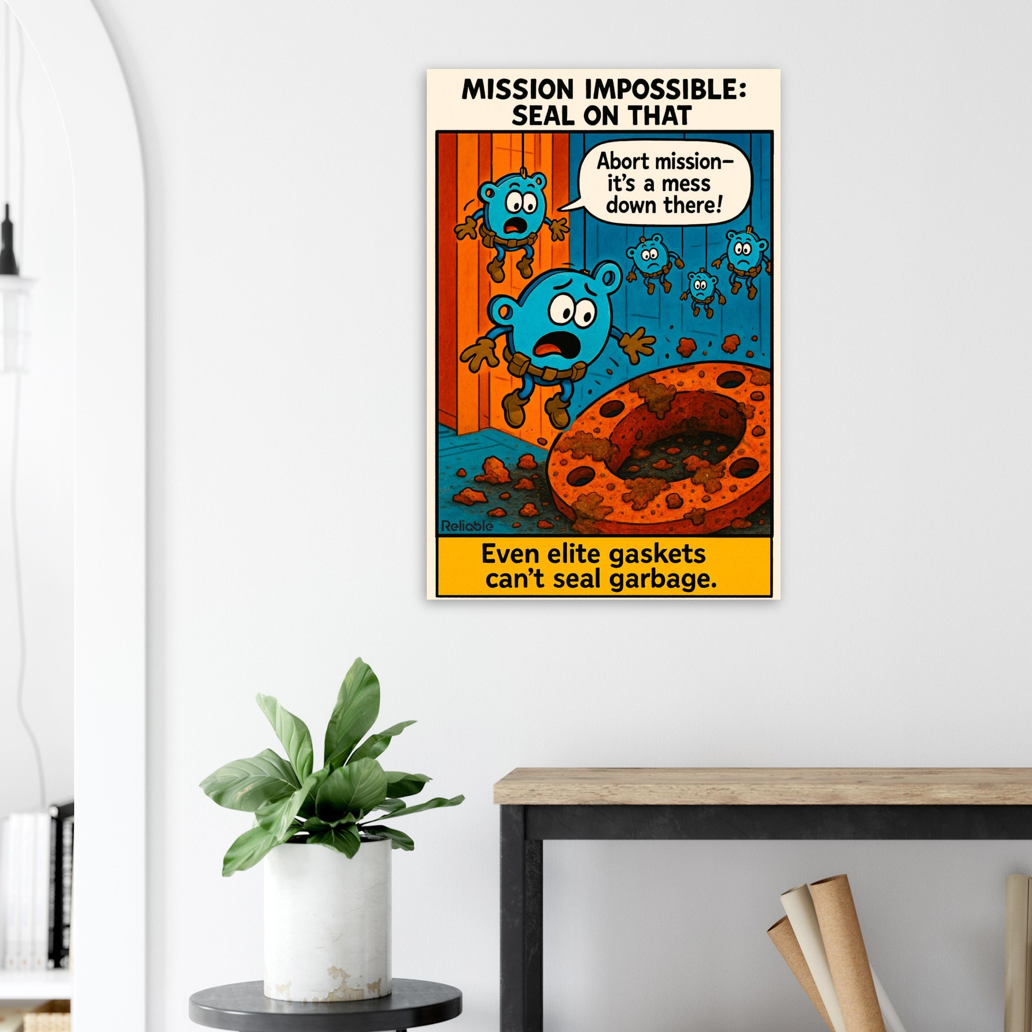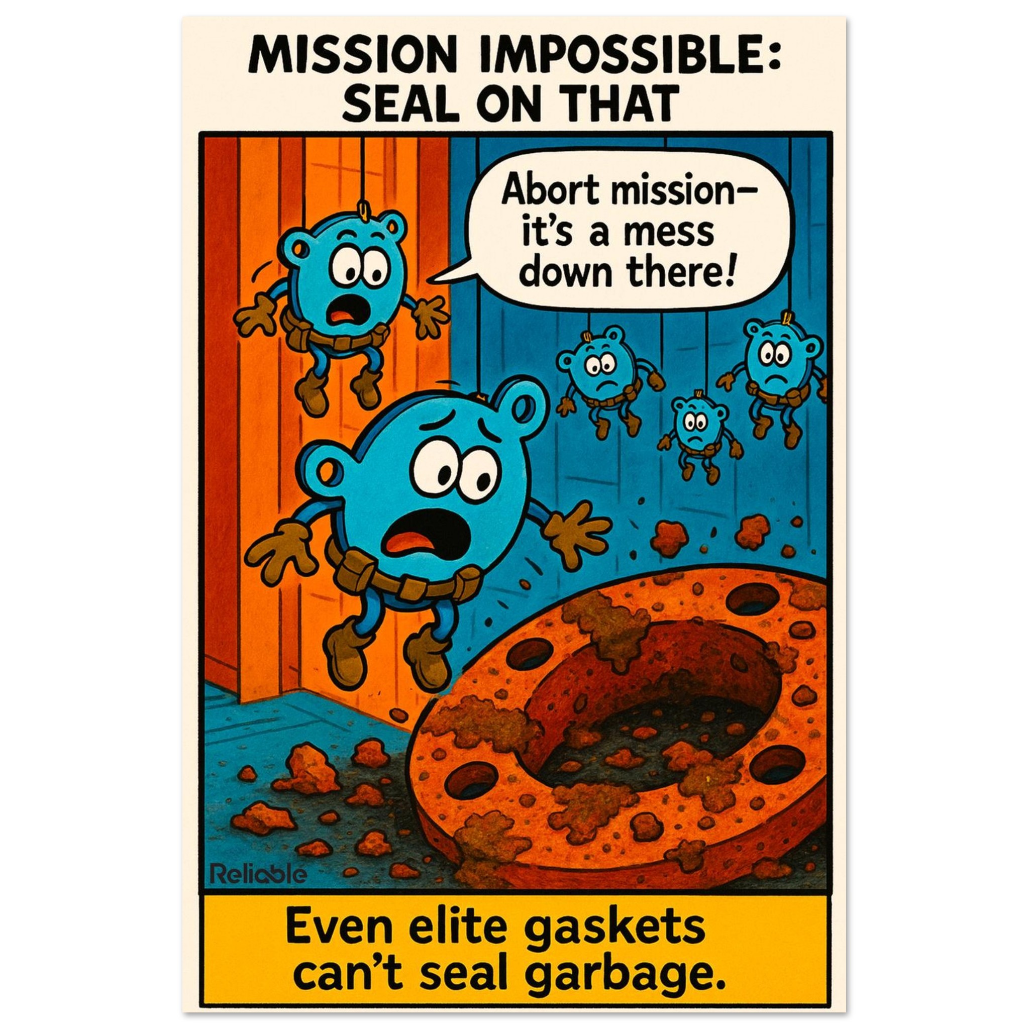 When even elite gaskets call it quits, you know the surface prep has failed. This hilarious, action-movie-style poster features a cartoon gasket SWAT team aborting their mission mid-air after spotting a disgustingly dirty flange. With the bold tagline “Even elite gaskets can’t seal garbage,” it’s a perfect training aid for reliability teams and maintenance crews. High-impact, full-color print for shops, classrooms, and break rooms that need both laughs and lessons.